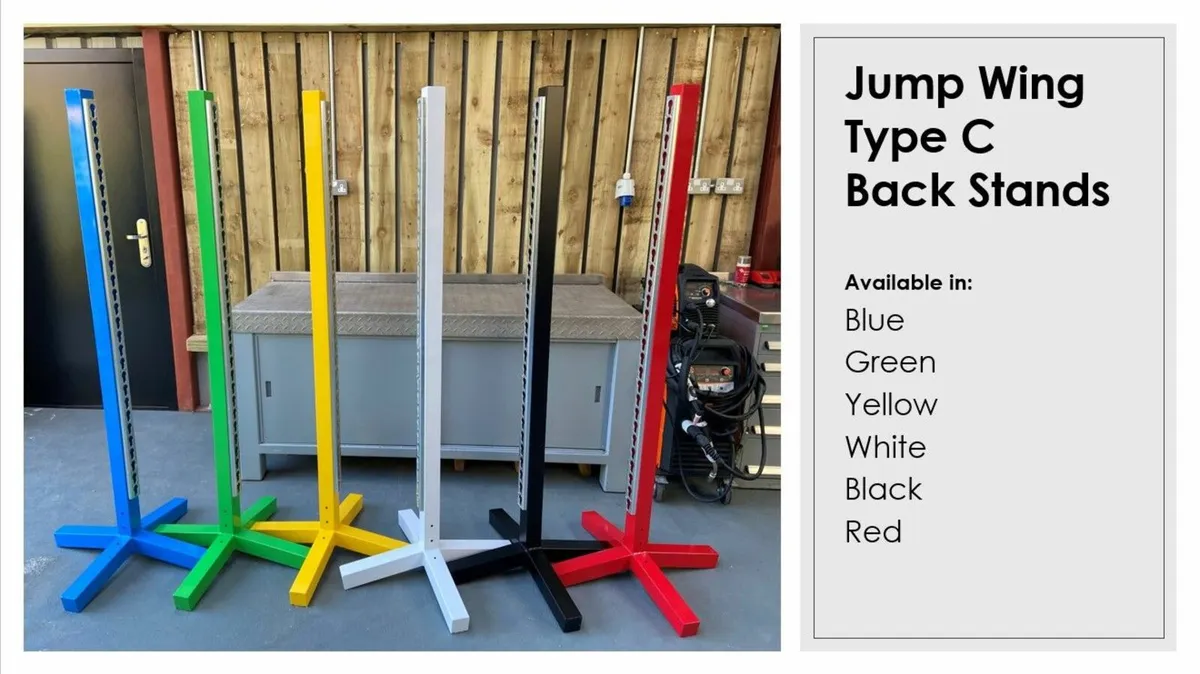 Brighten up your arena at home with these colourful Show jumping Training Wings, Back Stands, Hanging Fillers, Jump Cups, safety adapters and water Trays.