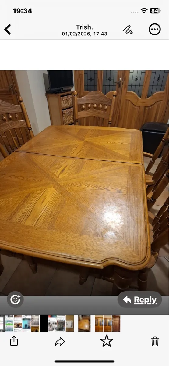 Extendable kitchen table with 6 chairs, 2 of which are Carvers, also 4 solid, panel red deal doors and a set of coloured glass doors.