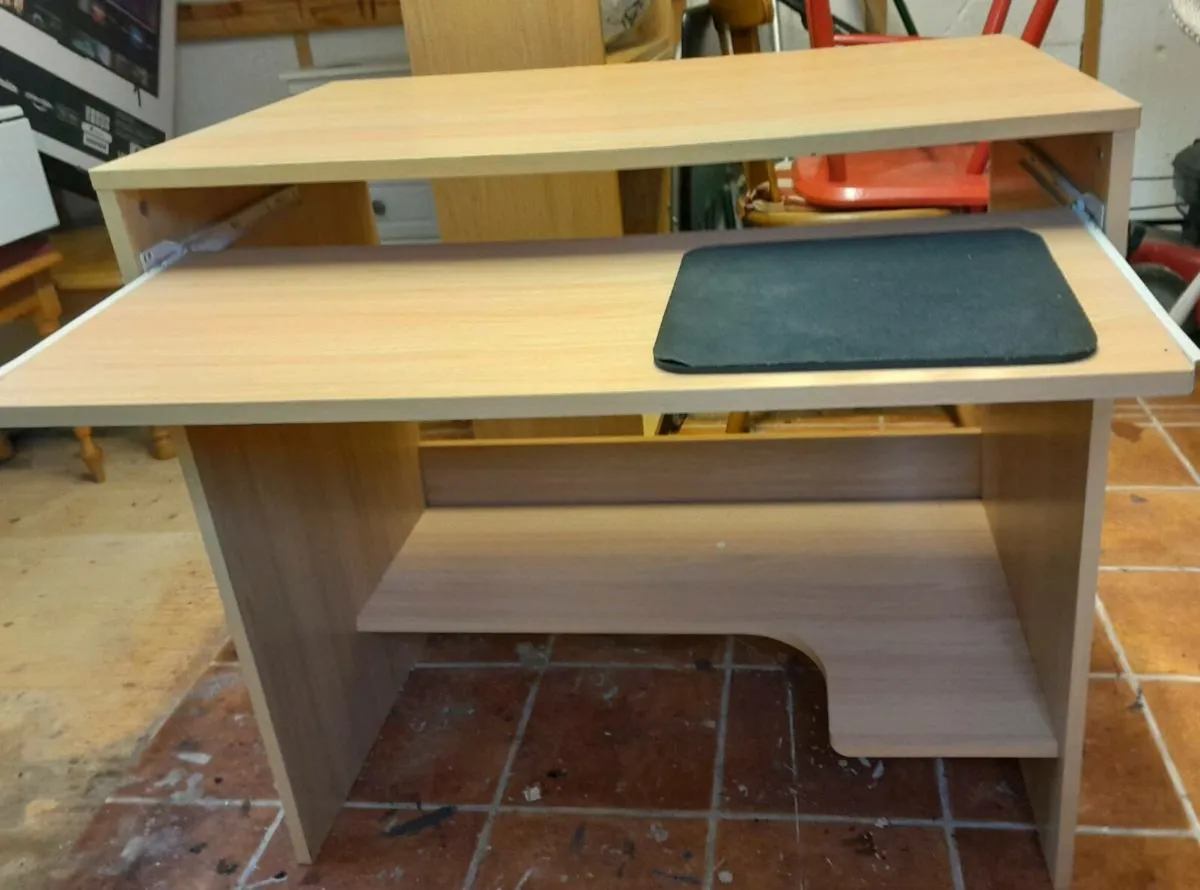 Computer desk with keyboard shelf and bottom shelf for hard drive. In good condition.