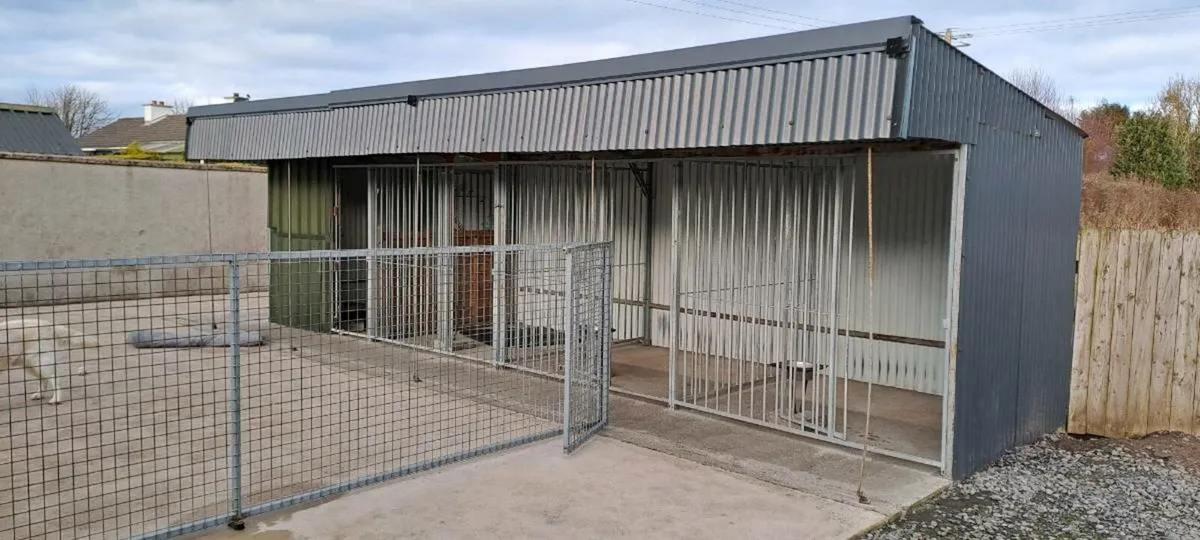 4 bay aluminium kennel block. Each kennel is approx. 7ft x 7ft. In excellent condition. Can be sold with cladding as seen or without. Originally supplied by Slaneyside kennels.