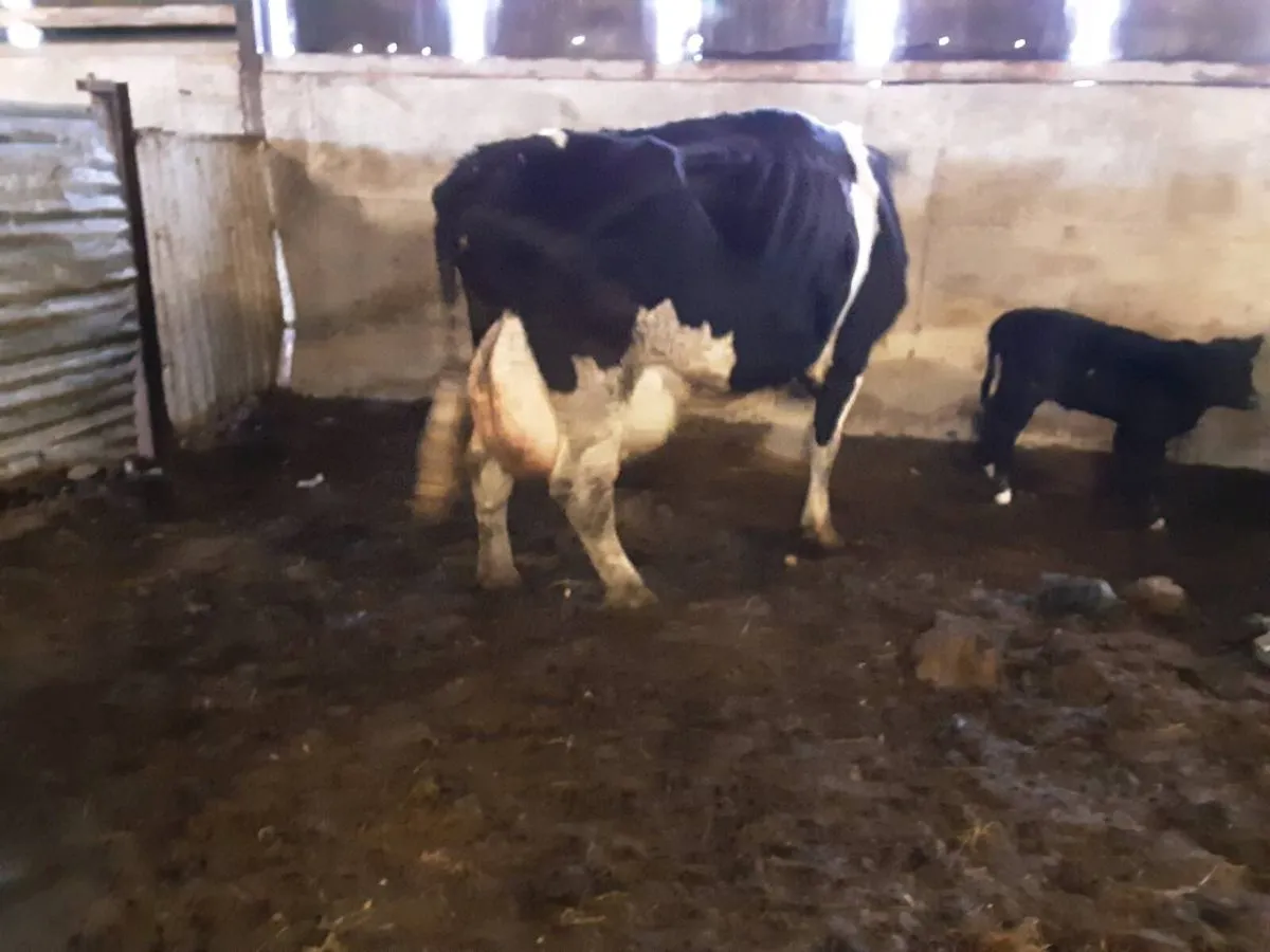 Freshly calved fresian cow with BB Heifer calf at foot. Suitable for rearing Calves