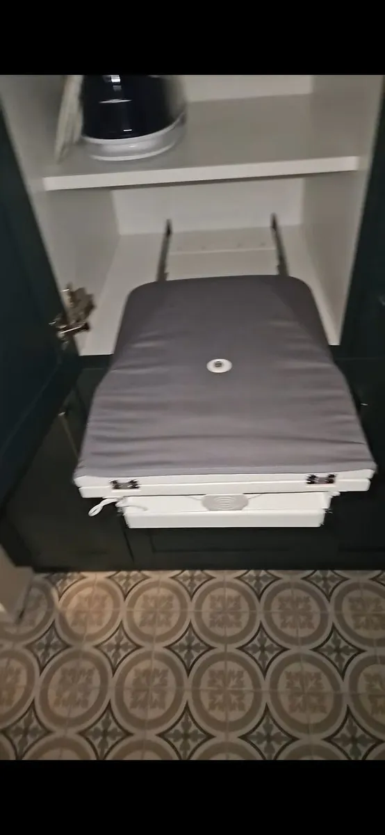 Buckingham soft close doors, pull out iron board, Includes hanging rail, 500m pull out bins, Internal shelving layout can be adjusted to suit your needs, Length 1980mm x 1700mm. Depth 604mm Height 2150mm Excellent condition, Washing machine and dryer is not included.