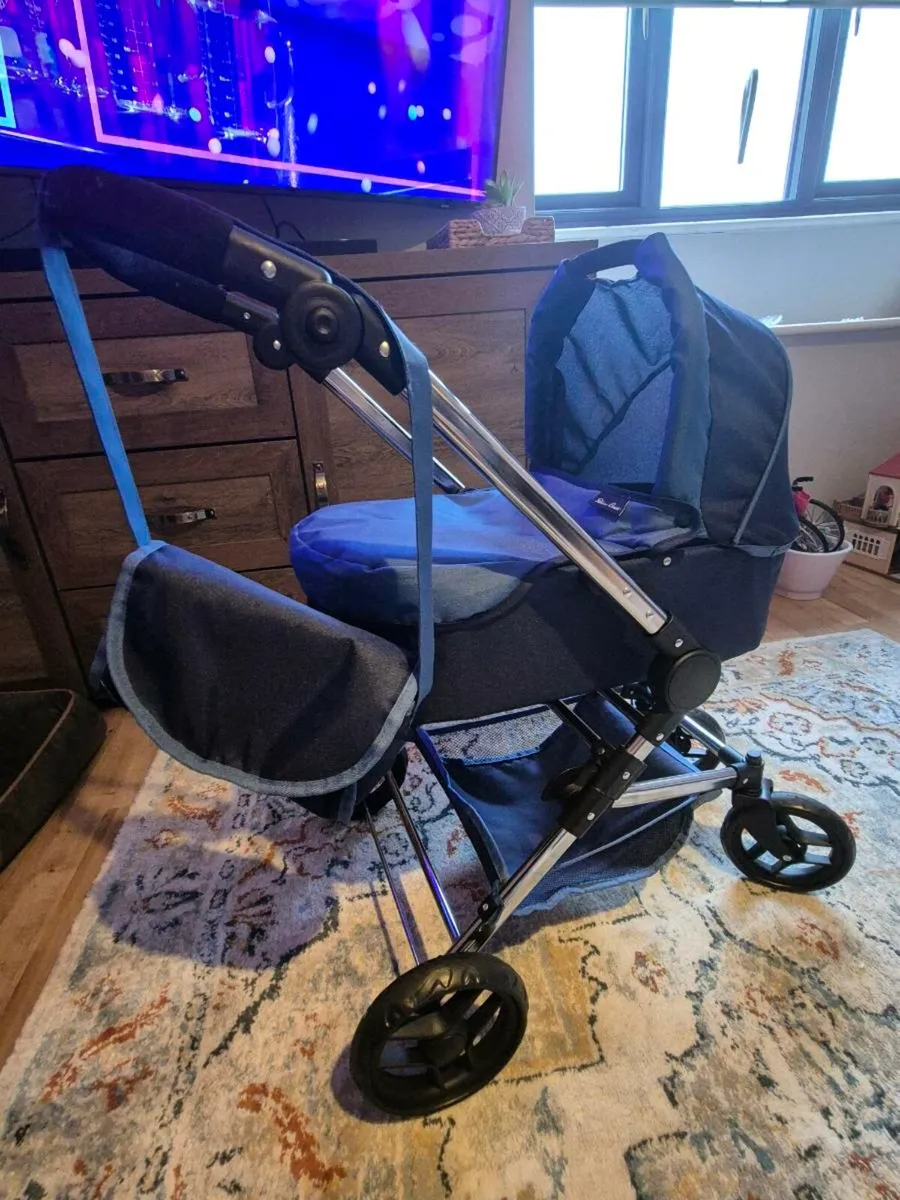 Kids silvercross baby doll pram...like new condition has a basinette and buggy part...forward and rear facing options, front swivel wheels comes with little changing bag to match...blue and navy colour.