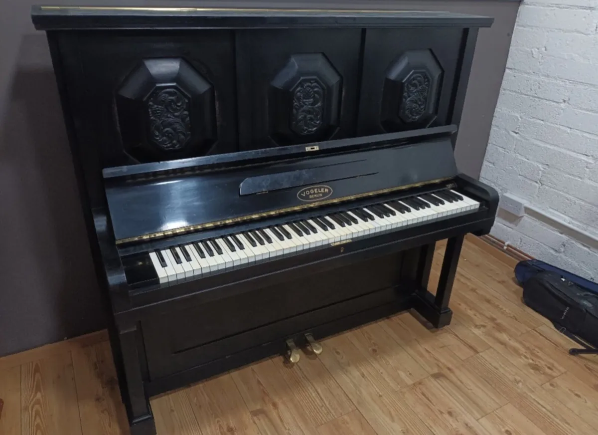 Rare and unusual Gothic Style Vogeler, Berlin, with tall decorative case and original ivory keys. By far the tallest overstrung grand concert upright piano we have worked on in years, measuring 141cm in height, giving it a commanding presence in a room.